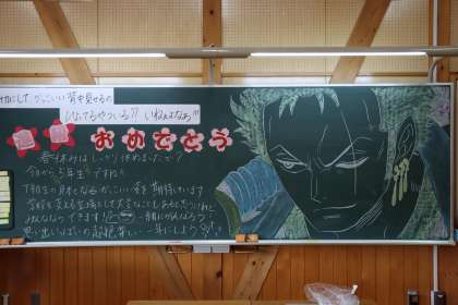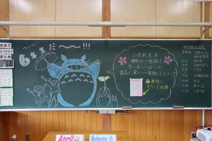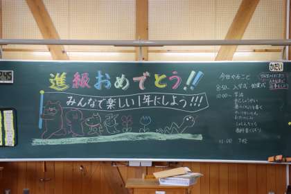 入学式・始業式のあとは、新しい担任の先生のもとで初めての学級活動です。今日のために先生たちはいろいろな準備をしました。黒板には温かいメッセージが書かれています。