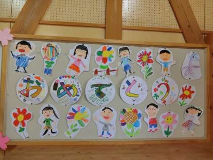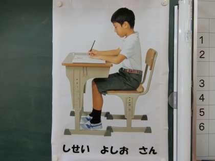 1年生教室は、上の学年の子たちが飾り付けをしてくれました。前の黒板には「しせい よしおさん」の写真が。これから一つ一つ学んでいきましょう。