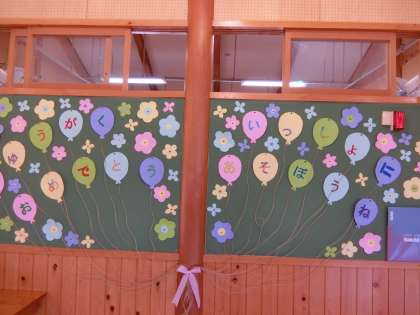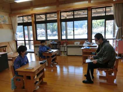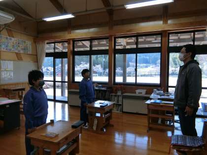 ともえ学級の様子です。5年生の子が号令をかけて朝の活動が始まりました。そのあとは、担任の先生が健康観察をします。「○○くん、元気ですか」「げんきです」。子どもたちも先生も、ついでに私も「はい、元気です!」