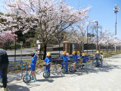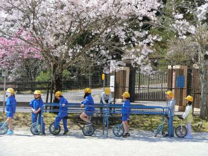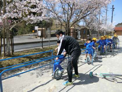 3日目(1年生) 公開日 2022/04/08 更新日 2022/04/08 各学年から 2時間目の途中に黄色い帽子をかぶった1年生が外に出てきました。さっそく一輪車練習です。巴ケ丘小学校では、6年間を通して一輪車に取り組みます。一輪車は全身運動であるとともに、バランス感覚や体幹が鍛えられます。担任の先生がサドルの前後を支えて、練習用ポールにつかまって進みます。初めは「おっかなびっくり」の子どもたち。10人の子どもたちがいるので、私(校長)も助っ人に入りました。