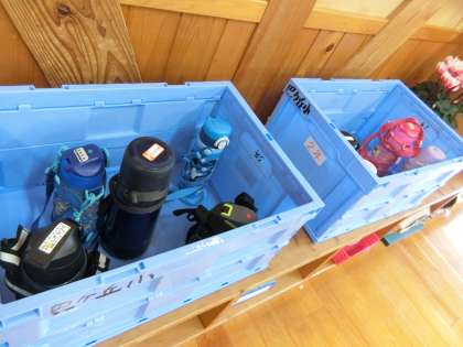 飲料水(お茶など)は1年中お子さんに持たせてください。特に暑い時期は多めにお願いします。スポーツ飲料でもOKですので、季節に合わせて量や中身を調節してください。1年生の教室にも水筒入れの箱が準備されていました。