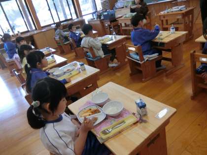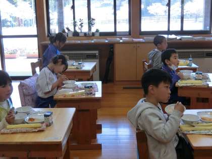 お行儀よく食べています。春巻き、中華スープ、おいしいかな?