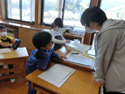 私(校長)が挨拶をしながら教室に入っていくと、子どもたちが気持ちよくあいさつをしてくれました。「きのうね、りすの体が長いみたいな動物がいたよ」「どのくらいの大きさだった?」「このくらい」。どうやらリスではなく、イタチかハクビシンのようなものみたいです。近くの男の子が「そのぐらいのやつは、ほとんどイタチだよ」と教えてくれました。