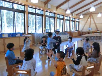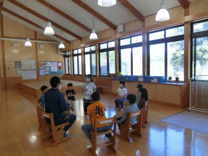 2時間目、1,2年生教室と、ともえ学級の教室があるワークスペースから賑やかな声が聞こえてきました。1年生が「なんでもバスケット」をしていました。椅子の数が一つ少なくしてある「椅子取りゲーム」のような遊びです。椅子に座れなかった子が、例えば「いぬ」と言うと、犬の好きな子たちが立ち上がって席を取り合います。単純なゲームですが、遊びながら友達の好きなものを知ることができて子どもたちはとても楽しそうです。