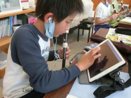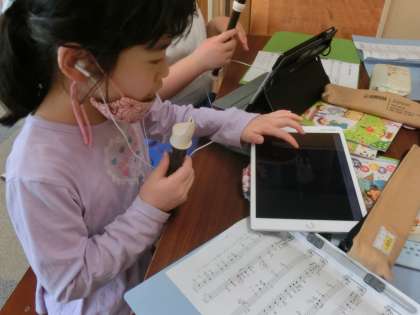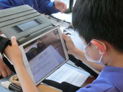 5,6年生の子どもたちは、タブレットと楽譜を机に置いてリコーダーの練習をしています。お手本の演奏でイメージをつかめますし、伴奏も流れます。イヤホンがあれば、自分のペースで何度も練習できます。