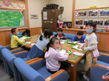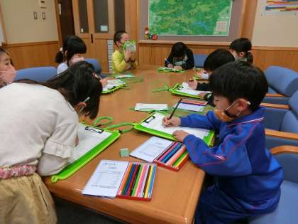 5時間目、1年生の子が校長室にやってきました。かわいいカードを首から下げて、探検バックを持って探検です。校長室の中の興味をもったものの絵を一生懸命に描いていました。かわいいお客さんたちでにぎやかです。