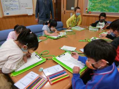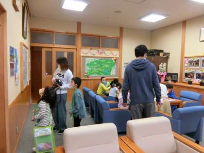 校内探検の様子です。壁に貼ってあるのものを見たり、「これはなに?」と尋ねたり、にぎやかです。
