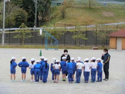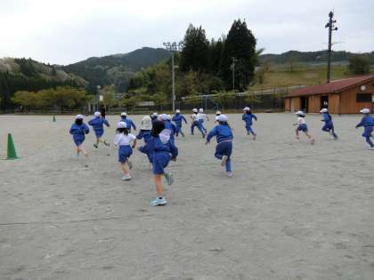 4時間目、運動場から元気な掛け声が聞こえてきました。1,2年生が体育の準備運動をしています。子どもの数が少ない本校では音楽と体育を2学年合同で行っています。体育の競技や音楽の合奏や歌は、ある程度の人数で行った方が楽しく効果的にできるからです。