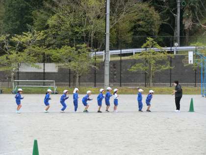 今日の1,2年生の体育は、先生から並び方を教えてもらい、すぐに並べるように練習することや、体を動かす基礎トレーニングなどを行っていました。指導するのは2年生の先生です。スポーツが得意で若さあふれる先生の指導で、子どもたちは広い運動場をいっぱいに使って、時間いっぱい、たくさん体を動かしていました。教頭先生も補助に入って授業を行っています。私(校長)も少しだけ飛び入り参加しました。子どもたちの元気さ、笑顔、はしゃぐ姿に嬉しくなりました。
