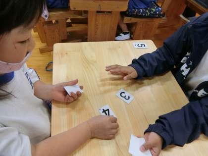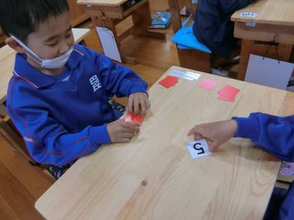 1年生の算数の授業の様子です。1から10までの数を勉強しています。「いっせいのーで!」の声でカードを出し合います。「どっちが大きいかな?」大きい数のほうが勝ち。楽しそうに勉強しています。