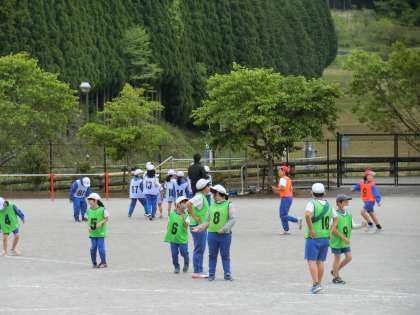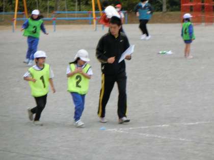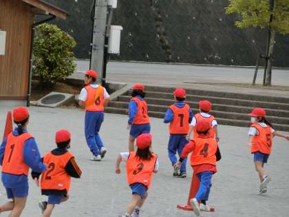 3時間目はリレーの練習です。縦割りグループで六色に分かれて競います。それぞれの担当の先生と子どもたちは作戦を考えたり、実際に走ってみたり、バトンパスの練習をしたりしています。
