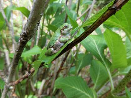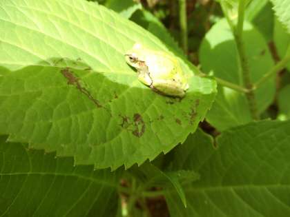 雨上がり、カエルが紫陽花の葉の上でじっとしていました。お日様の光を楽しんでいるかのようです。爽やかな朝です。