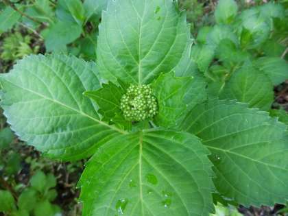 スクールバスが4台到着して、子どもたちが歩いていったあとのあじさい坂の様子です。雨上がりで、いつもに増して木々の緑が瑞々しく見えます。子どもたちがバスを降りて毎朝歩く学校裏のあじさい坂。こんなにすてきな通学路は他にはないといつも思いながら私も歩いています。あじさいの葉に包まれるようにして小さな蕾ができているのを見つけました。