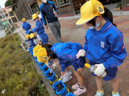 ペットボトルを使ってこれから毎日水やりをして大事に育てます。今年も秋に種ができて、来年の1年生にプレゼントできるといいですね。