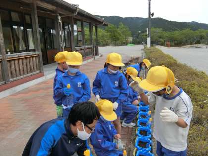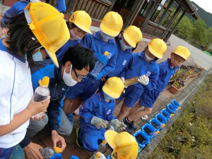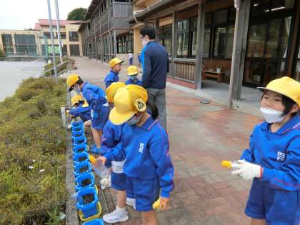 水やりの仕方を先生に教えてもらっているところです。やる気満々の1年生です。