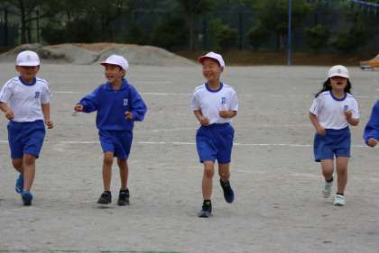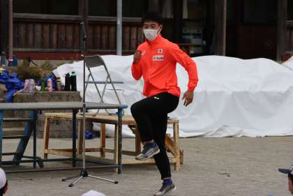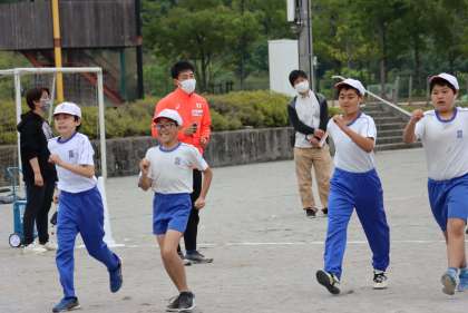 オリンピック選手によるご指導 公開日 2022/05/17 更新日 2022/05/17 学校行事 川端選手が子どもたちに質問しました。「歩くことと走ることの違いは何でしょう?」子どもたちは手を挙げて「スピードが違う」「歩くときには足が地面についているけれど、走る時はついていない」、「正解、すごいね」と川端選手。まずは正しい姿勢(前のめりや、目線が下がるのではなく「腰からピン!」とまっすぐです)と、教えてもらった腕の振り方で、速歩きを練習します。