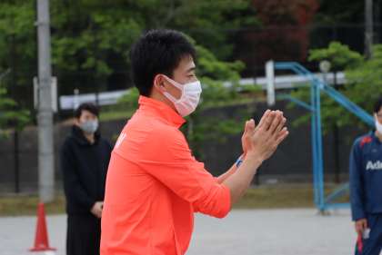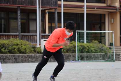 スタートの練習です。目をつぶって音に素早く反応する練習です。利き足を後ろに引いて、前の足に体重を乗せます。川端選手がわかりやすく良い例と悪い例のお手本を示しながら教えてくださいました。
