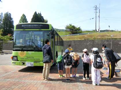 これは先週の木曜日の4年生交通安全教室の様子です。大きなバスが迎えに来てくれて、豊田市交通安全学習センターに行きました。「お世話になります、よろしくお願いします!」