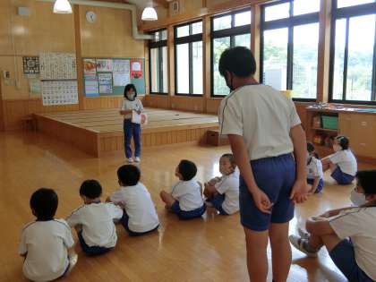 この場面は、1年生と6年生のお話集会の様子です。1年生の子が一生懸命に話したことに、6年生の子が優しく褒めながら感想を発表したり、質問したりしています。ほのぼのとした温かいやり取りが感じられました。6年生の子は、運動会でがんばったことを発表してくれました。