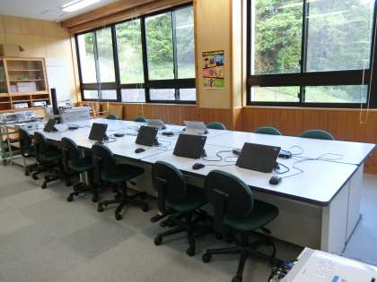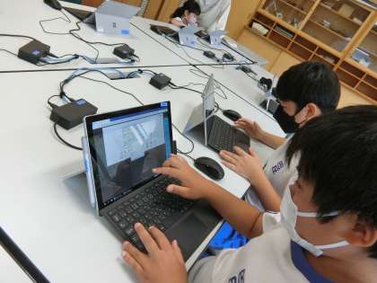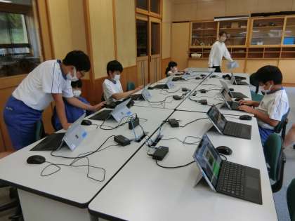 今までは手描きで作成していた「季節だより」ですが、5年生になったのでタブレットで作成することにチャレンジです。教室にも個人のタブレットはありますが(キーボードも個人用があります)、コンピューター室のタブレットを使うと、その場で印刷することができます。取材から帰った子どもたちが、コンピューター室で「季節だより」を作成しています。コンピューター室はこんな感じです。