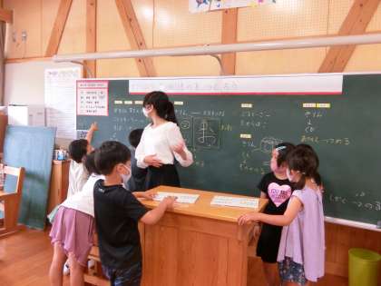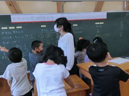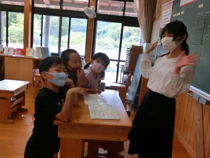 給食後の1年生教室です。毎週火曜日に本校で英語(外国語科と外国語活動)の授業をしてくださるアンドレア先生です。気さくで可愛らしく、授業になるとエネルギッシュなアンドレア先生。1年生が先生の周りに集まってあれこれ話しかけていました(日本語で)。大人気です。