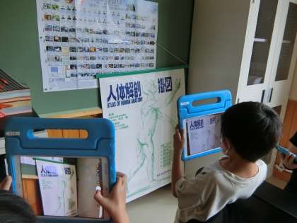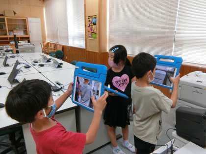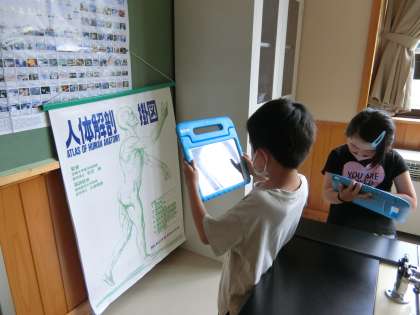 慣れた様子で撮影する1年生。コンピューター室のプリンターを見つけてパチリ、理科室の人体図を見つけてパチリ。撮れた写真は先生のところに見せに行きます。
