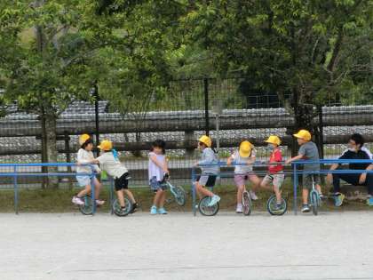 本校では6年間を通じて一輪車の練習に取り組んでいます。その成果を発表する場として4年生以上の一輪車演技(運動会)があります。一輪車は体幹を鍛え、バランス感覚を養うのにとても良いそうです。全身を使います。バス通学が多い本校の子どもたちは運動不足になりがちですが、体育の授業、運動会、放課の遊び、一輪車練習、冬季の縄跳び期間などで運動の機会を確保しています。