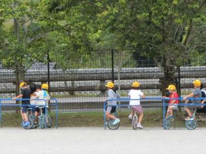 今日は1,2年生は5時間授業、3年生以上は6時間授業です。時間割が違ってもバス下校のため一緒に帰ります。下校の時間を待ちながら1年生が一輪車練習をしています。今年の1年生の子は活発な子が多く、いろいろなことにどんどんチャレンジします。少しぐらい転んでもへっちゃらなようです。何度も何度もチャレンジしています。