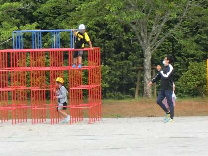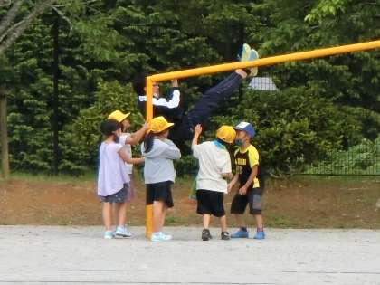ジャングルジムのところで子どもたちと遊んでいるのは1年生の先生です。「せんせい、せんせい」「ねえねえ」「せんせい、あそぼ!」という子どもたちの声が聞こえます。遊んでくれる先生が子どもたちは大好きです。底なしの元気さに先生もきっとくたくたでしょうけれど微笑ましい光景です。