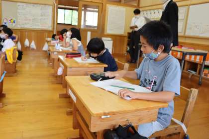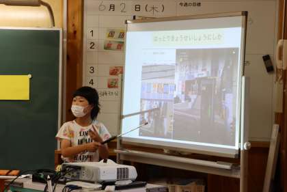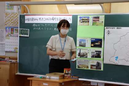 3年生の社会科では、まず自分たちが暮らす学区や学校の周りのことについて気が付いたことを話し合ったり、調べたりして学びます。次に、学習の範囲を豊田市全体に広げて、地図についての知識なども身につけながら豊田市の特徴などについて学びます。先生は、地図や写真、ICT機器などを使って、子どもたちが考えたり発表したりしやすくなるように工夫していました。