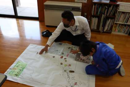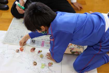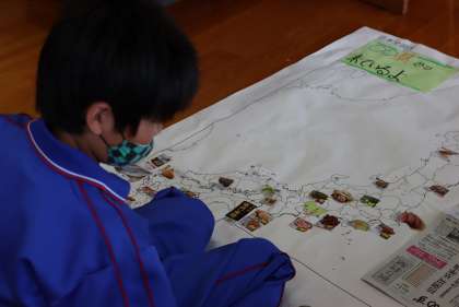 今日はその復習と確認です。今日先生が準備したのは、白い日本地図とスーパーのチラシの切り抜きです。ホウレンソウ、いちご、大根、ジャガイモ、いろいろな写真の切り抜きをたくさん集めて準備しました。ともえ学級の子が今まで勉強したことを思い出して地図に写真を当てはめていきます。見事、正解!「宮城、宮崎」「福岡、福島、福井」など似たような県でちょっと困ったそうですが、勉強の成果はバッチリです。がんばりましたね!これからも忘れないように復習していきましょう。
