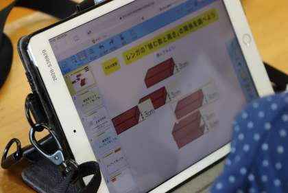 5年生の子どもたちが初めて『比例』に出会う授業です。先生はタブレットの発表ノートに子どもたちが思考錯誤できるワークシートを何種類か準備しました。