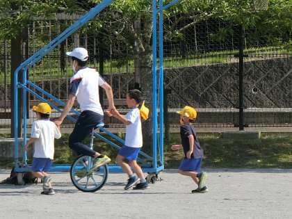 1年生の子どもたちが下校の時間を待ちながら外で遊んでいます。歓声が聞こえてきます。担任の先生が乗る一輪車に付き従うように子どもたちが走っています。手をつないでいる子もいました。すごくうれしそうな子どもたちの笑い声です。