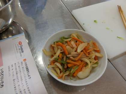 6年生はニンジン、ピーマン、玉ねぎなどの野菜を使った野菜炒めです。味付けは塩とコショウ。シンプルな味付けです。ある子が「野菜の味がよく分かる」と言っていました。栄養満点ですね。