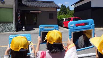 子どもたちが立ち止まってタブレットで何かを撮影しています。何を発見したのかな。わかりました!床屋さんのグルグルですね。やよい橋のそばの信号を渡ったところですね。