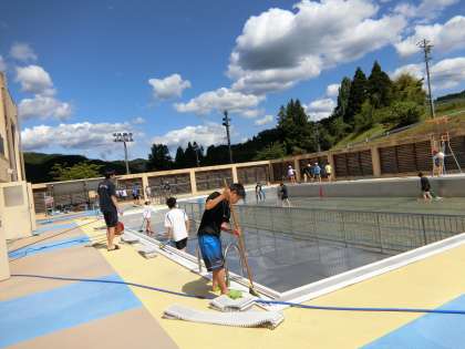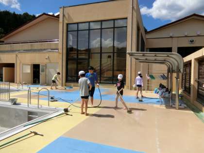きれいになったらプールに水を張ります。プール開きが待ち遠しいですね。空と雲と太陽がキラキラです。4,5,6年生の子たち、ありがとう。お疲れさまでした!