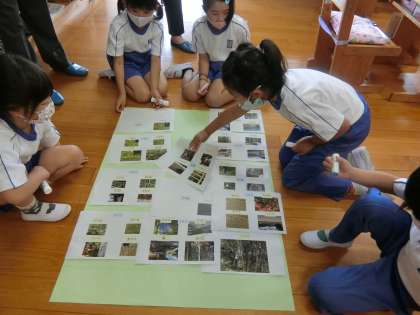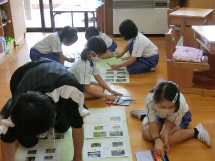 今日は先生が準備した大きな紙に、みんなの写真を集めて貼っていました。いろんな写真を集めると立派な「学校の周辺ガイド」ができますね。感心したのが1年生の子たちの話し合いの様子です。どこにどうやって写真を貼るのか、上手に話し合あって自分たちで決めていました。作業もテキパキしています。しっかりした1年生の子どもたちです。