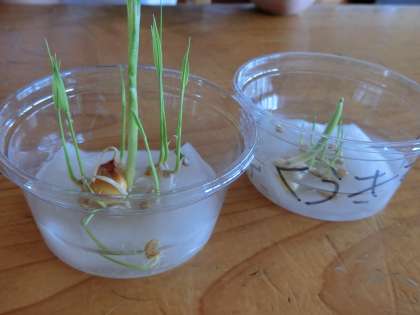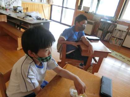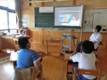 ともえ学級の社会科です。子どもたちが熱心に映像の説明を聞いていました。ふと見ると、細く葉を伸ばした稲が子どもの机に置かれていました。水に浸した籾(もみ)が発芽していました(ほかの植物のたねも混ざっています)。