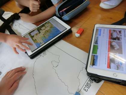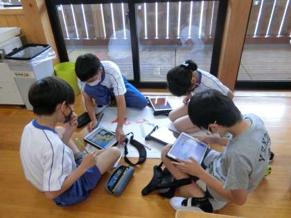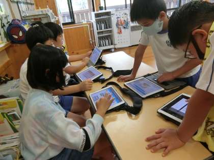 3時間目、5年生は社会科です。2つのグループに分かれて、全国にはどんな品種の米が主に作られているのかを表にまとめていました。分担してタブレットを使って調べ、調べたことを地図に色分けするなどしてまとめていくようです。