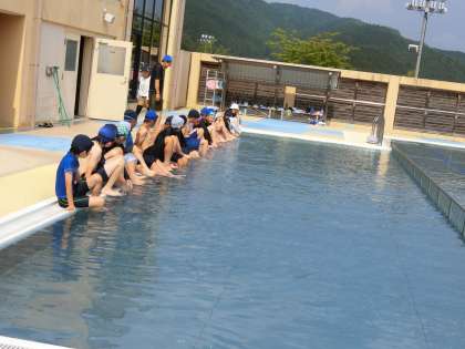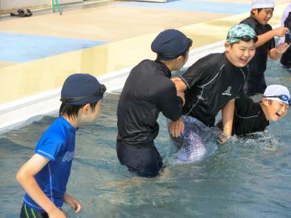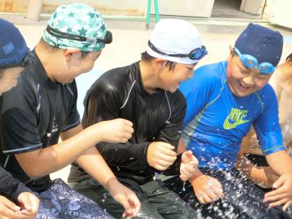 6時間目のプールです。ともえ学級の子と5,6年生がプールに入りました。足をちょっと水につけて「冷たい!」と言っていた子どもたちでしたが、先生の声掛けでだんだん水に慣れていくと、どんどん水にもぐったり泳いだり、宝探しを張り切ったりと、笑顔が弾けて歓声が上がっていました。すごく楽しそうです。
