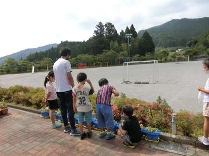 2年生が校外学習に出かけていく横で、1年生はアサガオに水やり中です。