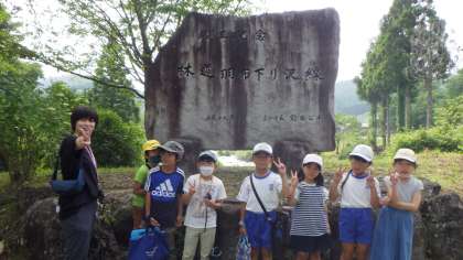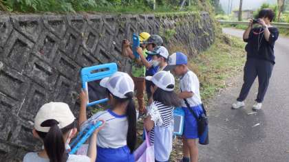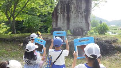 2年生の校外学習の様子です。子どもたちは学区を歩いてきました。気になるもの、発見したものをタブレットで撮影しました。コンクリートの壁に向かってタブレットを向けて撮影する子どもたち。なにが気になったのか「気になるポイント」をまた聞いてみたいと思います。