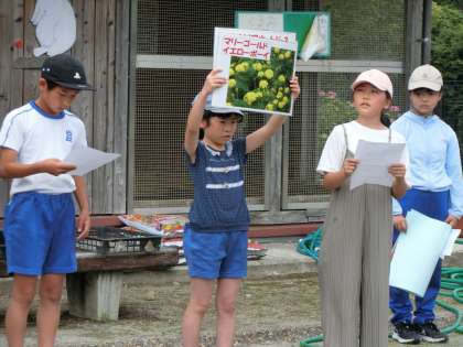 WBGT値が大丈夫なことを確認し、マスクを外し、帽子をかぶり、水筒を近くに準備してウサギ小屋のそばに集まりました。準備された苗は6種類ぐらいあり、その中からひとり3ポットを選んでマイプランターに植えます。どんな植物があるか、委員会の子が写真で丁寧に紹介してくれました。どんな色のプランターにするか考えるのも楽しいですね。