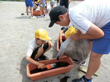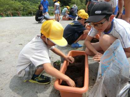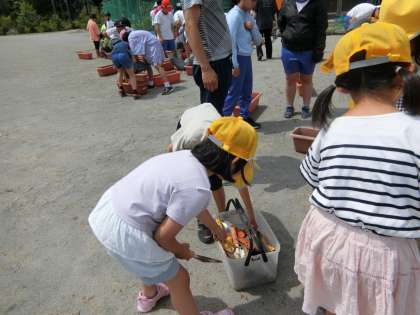 花いっぱい活動の様子です。異学年でペアを組んで土入れ、苗選び、植え付け、プランター運びをしました。上の学年の子が低学年の子たちに優しく教えたり、重い土の袋を一緒に持ったり、プランターを運んであげたりしていました。