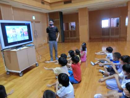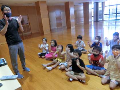 2時間目、1,2年生の音楽です。「アルプスいちまんじゃく」の歌に合わせて手遊びをします。先生がICT機器を使ってお手本の動画を見せて、まずはゆっくりのテンポから一人練習をします。