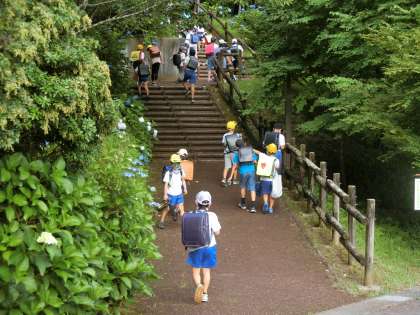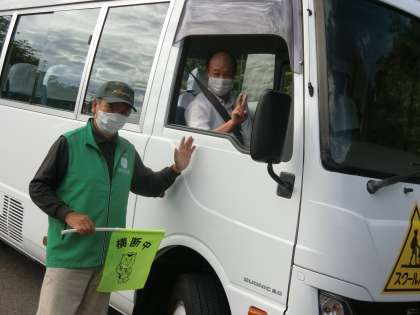 子どもたちが登校してきました。民生委員さんがあじさい坂のところで子どもたちを迎えてくださいました。スクールバスの運転手さん、民生委員さん、ありがとうございます!