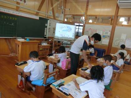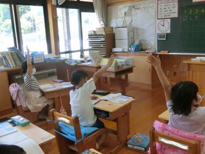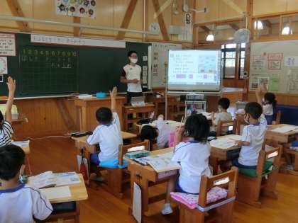 12時です。もうすぐ給食の時間です。おなかが空いてきたことでしょう。1年生は算数の授業です。4月に比べると難しくなってきましたが、元気よく手を挙げていました。