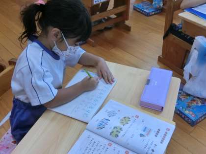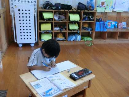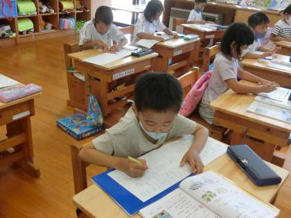 勉強しています。よく見ると髪の毛が濡れている子がいます。3時間目の予定だったプールを、暑さのことを考えて2時間目に繰り上げました。