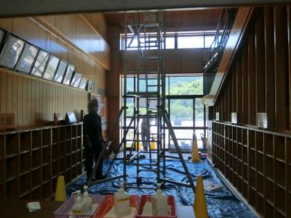 WBGT値が31(危険)を超えました。昼の放課は外遊びができません。2時間目のあとの放課は数人が外で遊んでいましたが、午後はちょっと無理でした。下山は、豊田の市街地と比べると2度ほど気温が低めで、たまに「下山は涼しいでしょう」と言われます。地元の方も「豊田の軽井沢」と冗談で言ってみえる方がいらっしゃいました。が!暑い時はしっかり暑いです!子どもたちは涼しい室内で(扇風機と冷房で本当に快適です)工夫して意外と上手に遊んでいます。今日は、児童玄関の電気をLEDに交換する作業が行われています。