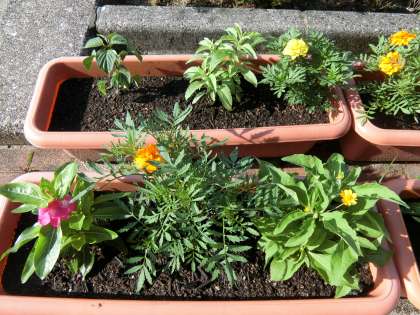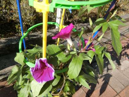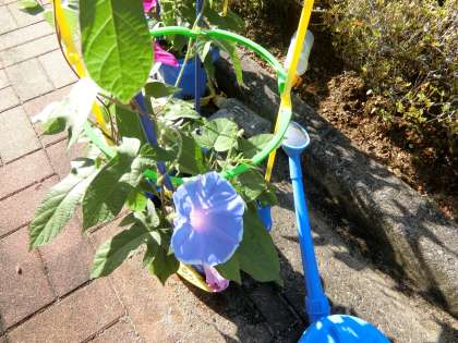 おはようございます。今朝は良い天気です。これから気温も上がってきそうです。1年生が育てているアサガオの花が、先週の始めに1輪咲きました。そこから次々と花が咲いて、今はどの子の鉢にも花が咲いています。マイプランター活動で植えた日日草やマリーゴールド、サルビアの苗も上に伸びて花を咲かせ始めました。